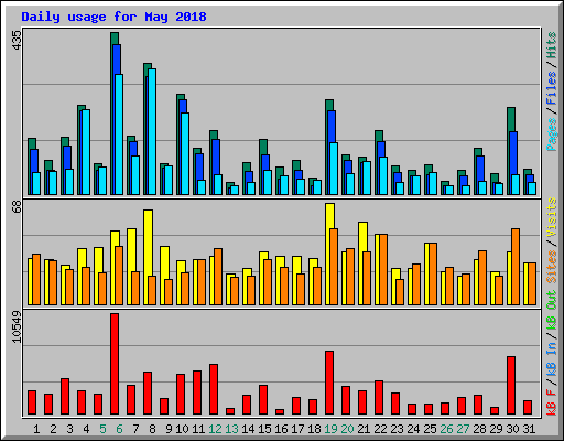 | Day | Hits | Files | Pages | Visits | Sites | kB F | kB In | kB Out | ||||||||
